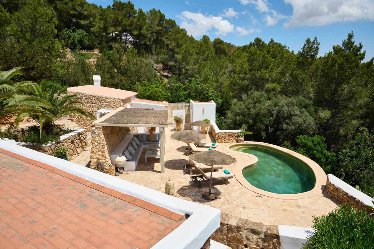 Idyllic charming villa with great rooftop seaview/sunset. Pool (8x5m), BBQ, walled 1200 m² garden. 3 bedr (1 with separate entrance)/2 bathr. Beautiful location: Fully private but not remote: 5 min by car/taxi (or walk) to gorgious beaches, cliffs, exquisite restos, supermarkets and buzzling harbor town with jetskis, sailing, dancing, ... . Going north you are close to the wild nature west side of Ibiza, going south to the sunset strip & parties. Come and stay in the real Ibiza!