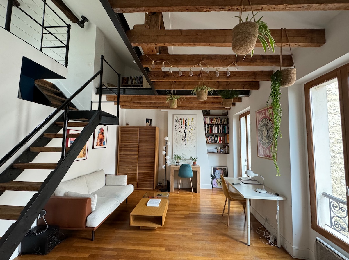 Bright loft of 60 m² with large private green terrace, 5 minutes walk from Rue Mouffetard. Ideal for two people. Comfortable living room, upstairs bedroom with queen-size bed, dressing room, bathroom with walk-in shower, separate toilet, equipped kitchen, fast WiFi, washing machine. A quiet and elegant cocoon for a stay for two or a professional trip in a lively and authentic Parisian neighborhood.