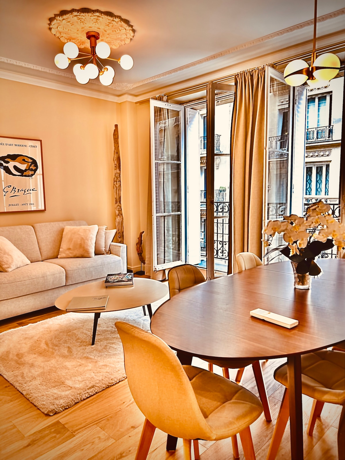 Overlooking our stunning inner courtyard and the charming neighboring church, your pied-à-terre offers open views, incredible natural light, and absolute tranquility—right in the heart of Paris. Each apartment includes a living room with a sofa bed, a dining area with a round table, a beautiful bedroom featuring a luxury hotel–quality bed, a fully equipped open kitchen with a dishwasher and washer-dryer, a shower room, and a separate toilet.