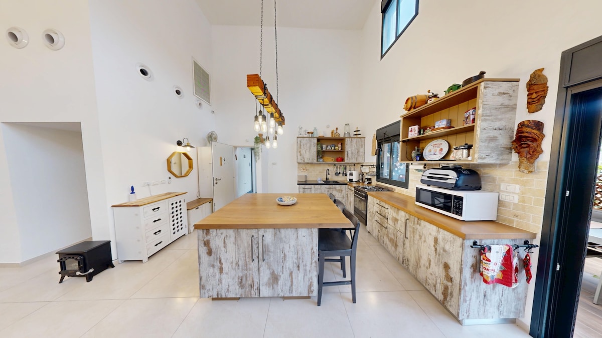 our duplex combines rustic charm with modern luxury. The dramatic 6-meter high ceiling creates an extraordinary sense of space and light, while the expansive 28m² balcony offers breathtaking views. Just 2km from the Mediterranean, you'll experience the rare pleasure of mountains meeting sea. The fully equipped rustic kitchen, and spacious bedrooms ensure comfort meets elegance throughout. Northern Israel's natural beauty meets thoughtful design and genuine hospitality.