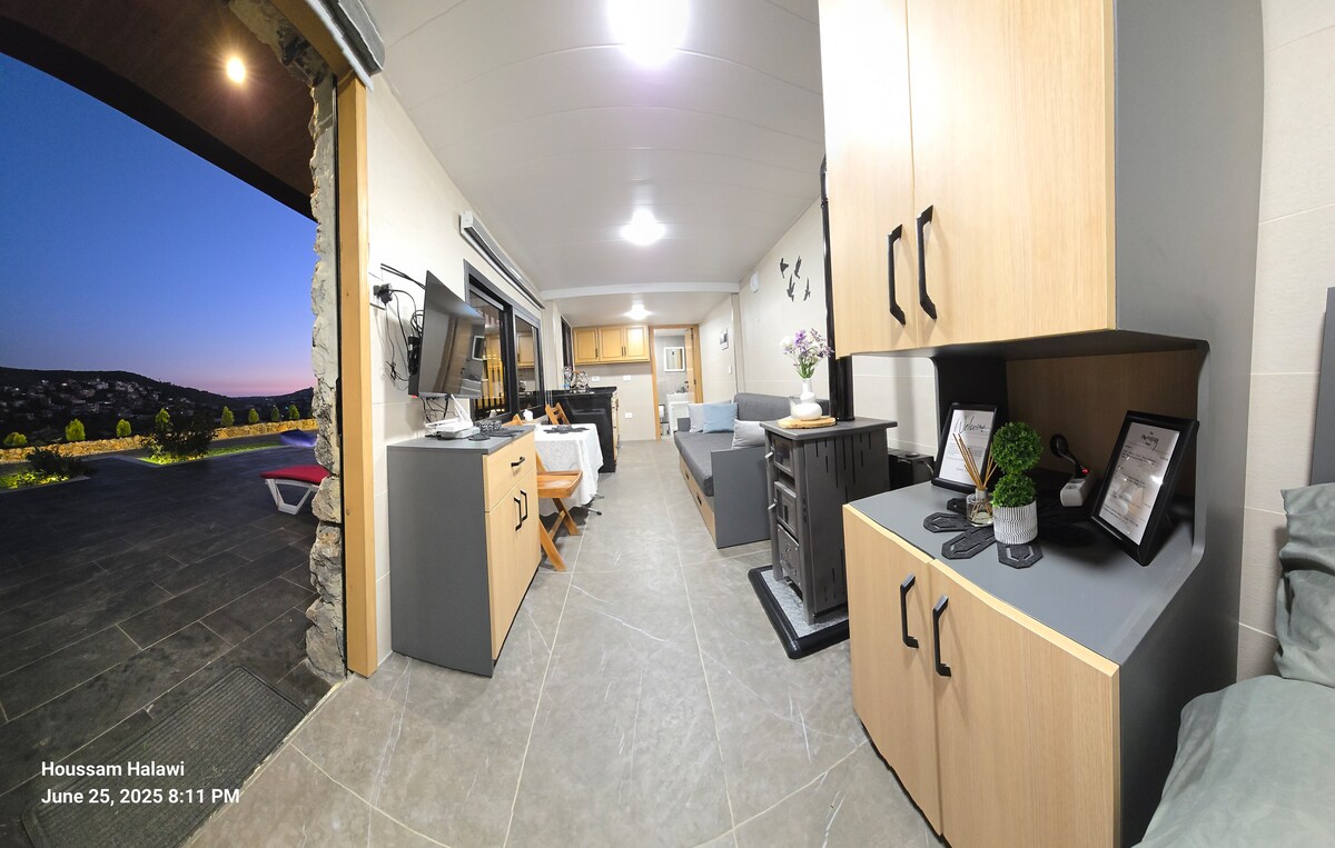 Our chalet is equipped with a solar system and consists of a master room, a kitchenette and a bathroom with shower. You can enjoy watching movies on Netflix on the smart TV. The outdoor area includes a terrasse opposite to Chouf mountain with a barbecue area, shisha area,m and a swimming pool. Both outdoor and indoor areas can be used for your event celebrations. Parking capacity is 10 cars. Sleeping capacity is 4 people (inflatable mattress available upon request).
