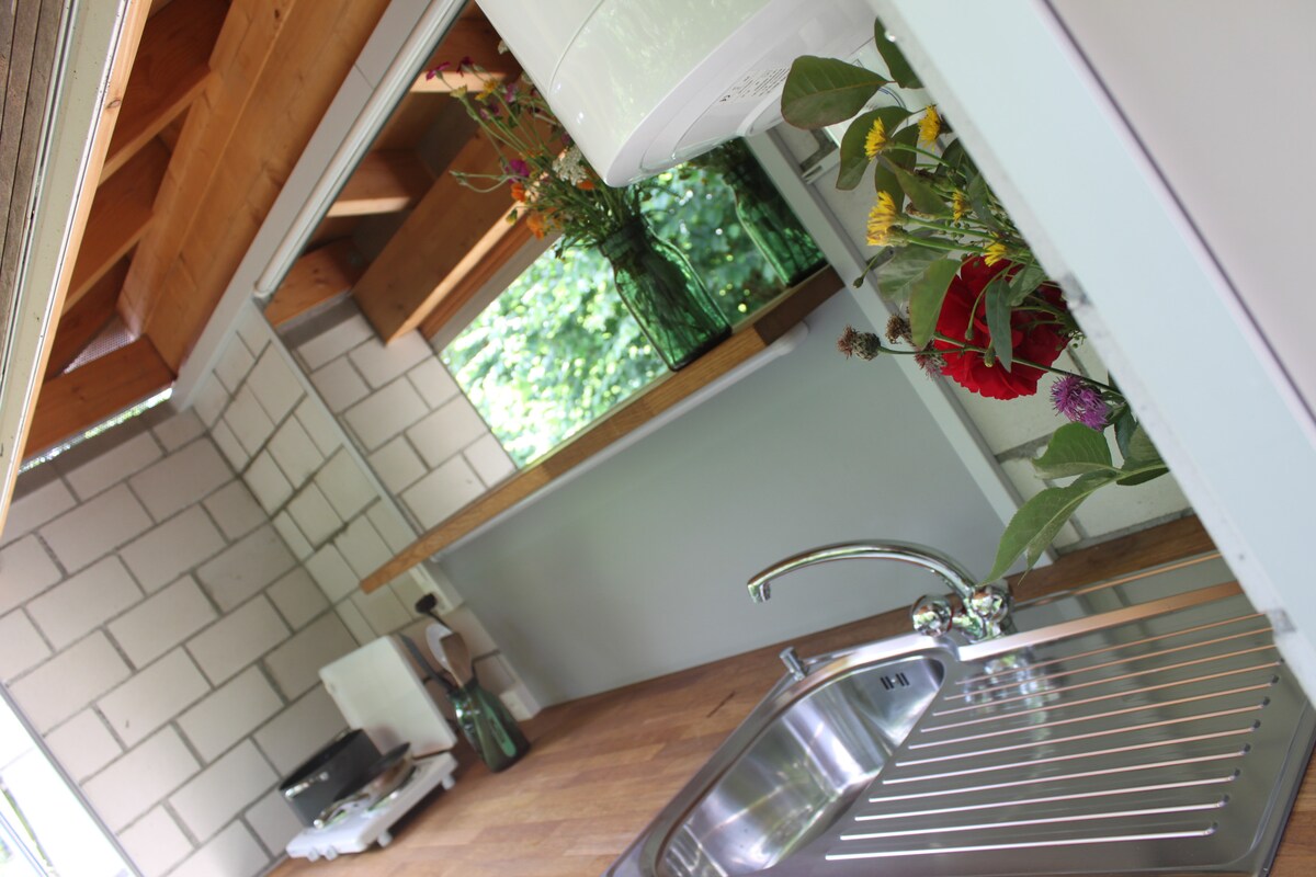 The tiny home is part of a former farm estate. The former barn was converted into a separate small house with three living levels (total 50 m²). First level: fully equipped kitchen (refrigerator, oven/microwave and dishwasher), underfloor heating and seating area with wood fireplace and sofa bed. Upper levels: bright bathroom and sleeping area with double bed (180 x 200). Private outdoor area with water area and fireplace. The laundry room can be used.