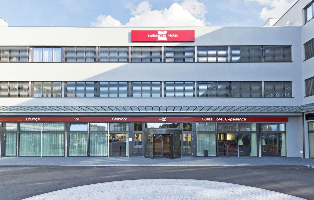 Cozy 22.3 m² room with one queen or two twin beds, ideal for short stays. Features a spacious work desk, shower, hairdryer, slippers, and make-up mirror. Enjoy free basic Wi-Fi, flat-screen TV with SAT and Pay TV, minibar, tea/coffee maker, safe, and telephone. Designed for comfort with a touch of Swiss elegance.