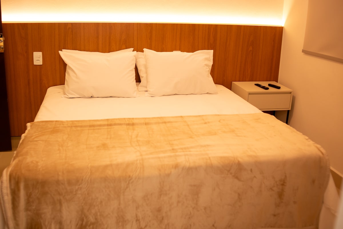 Studio para até 3 hóspedes, no centro da cidade, a poucos metros de padarias, restaurantes, lanchonetes e supermercado. Ideal para 3 solteiros ou casal + solteiro. O espaço conta com ar-condicionado, TV, iluminação ajustável, banheiro privativo e cozinha equipada com micro-ondas, misteira, cafeteira e frigobar, além de mesa de trabalho. Prático, confortável e localização privilegiada