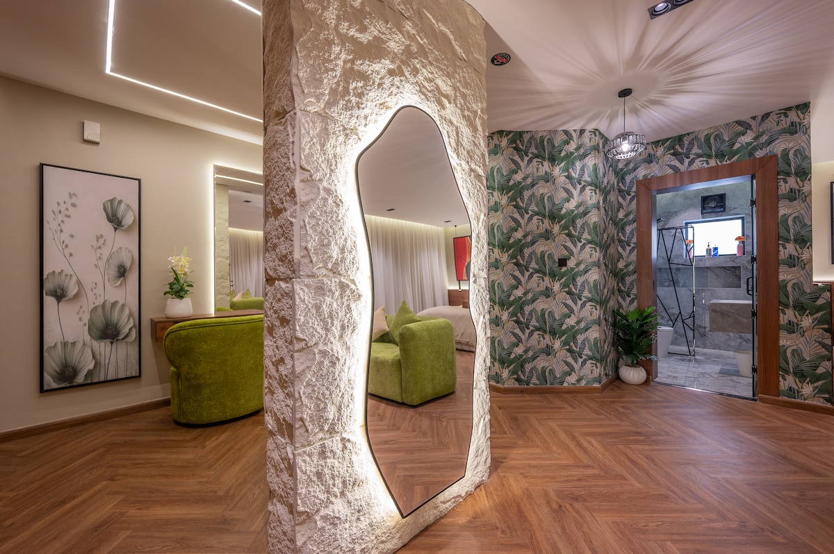 Upon entering the residence, you will be dazzled by the unique design starting from the self-check-in, which includes a luxurious bedroom equipped with a king bed, a spacious living room with a comfortable sofa for relaxation, and a 75-inch TV screen with Netflix, YouTube, and Shahid There is a lounge with a dining table and a great tablecloth, a kitchenette with an electric oven, a coffee corner, a kettle, a teapot, water bottles, a refrigerator and a microwave. Bathrooms are equipped with bath and care supplies, towels, single-use slippers, toilet paper, and a private parking lot.