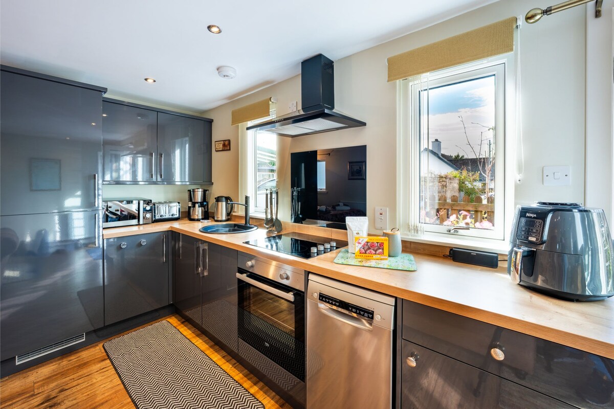 The Courtyard Bothy offers light, spacious accommodation with an enclosed, south facing garden which is a sun trap on sunny days. It is equipped with everything you need for your holiday. It is on one level with a parking space right outside with an EV charger. It's only a couple of minutes walk from the Town Square where there is a supermarket, cafes & restaurants. Surrounded by nature, woodland/river walks start across the road. Dogs are welcome, just let us know when making your booking.
