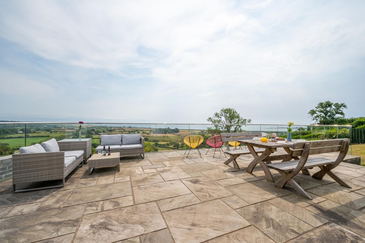 Converted carriage barn 5 mins from beach. Two bedrooms, shower room and utility room downstairs. Contemporary open-plan sitting room, fully equipped dining/kitchen, french doors onto large balcony with panoramic views of Snowdonia and coast. Luxurious bedding and towels provided. Dishwasher, washing machine, microwave, fridge, freezer and full cooker, super fast WiFi. Outdoor furniture and cool boxes. Space for boats, paddleboards, bikes. One pet welcomed. No charging for electric cars.