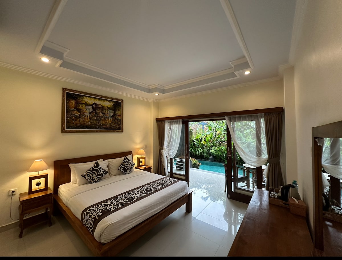 Experience the refined charm of this beautifully designed private villa, located in a tranquil area of Ubud. This luxurious one-bedroom retreat features an inviting private pool, open-plan living and dining areas, and a peaceful garden surrounded by tropical greenery. The price of your stay includes the following amenities : Breakfast for two persons Wifi Dringking water Linens and Towels Cleaning the room and change the towels and linens. Toilet paper Soap, shampo host will ready 24 hours