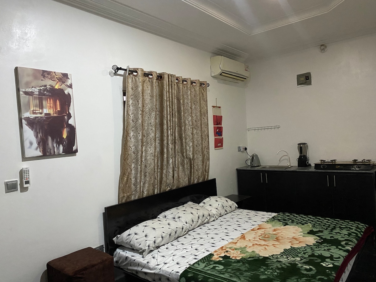 Step into our exquisite studio flat, housed within a gated residential estate nestled in the heart of Life Camp, Abuja. Experience the epitome of comfort and style in this thoughtfully designed space. Simplicity Redefined: Enjoy modern living at its finest. Lounge on our sofa bed, catch your favorite shows on a smart TV, and indulge in a rejuvenating night's sleep.