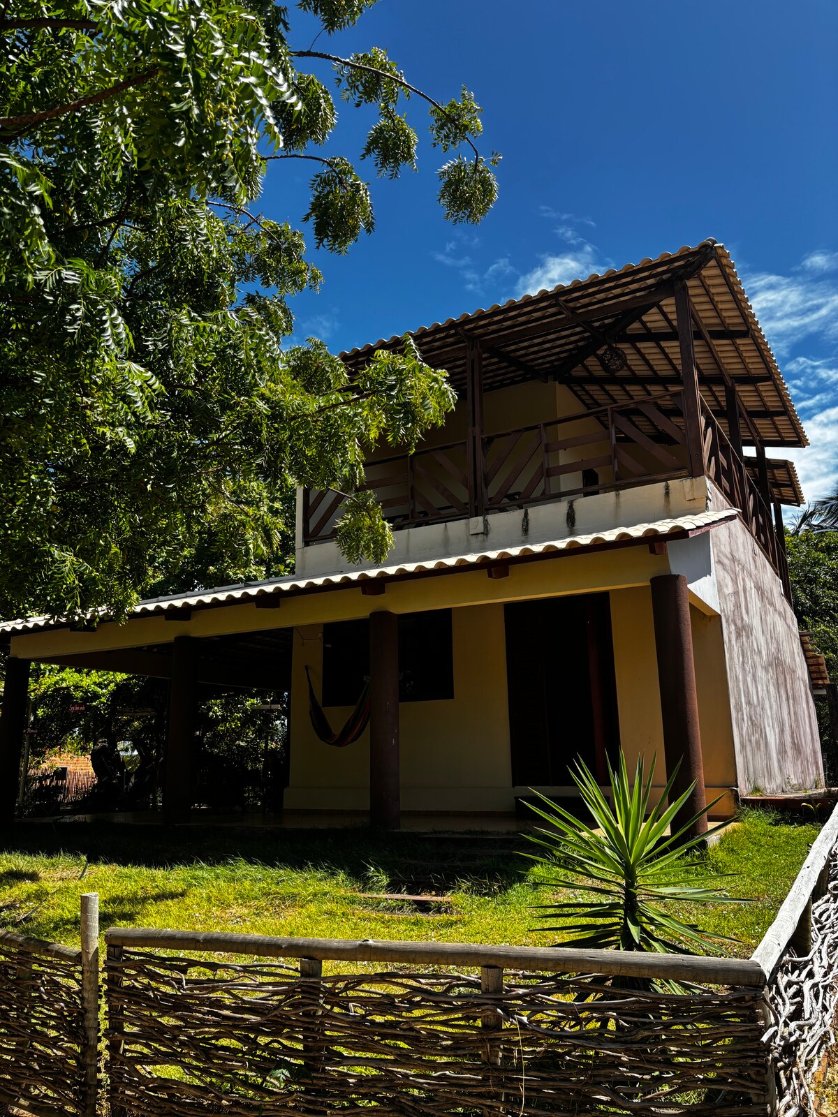 Vila Hillia is located on the shores of the Pinguela lagoon. It is a rustic and comfortable retreat amidst a coconut grove, just steps from the lagoon and the sea. Ideal for those seeking tranquility, nature and privacy. The house is spacious, airy, with a large balcony, lawn garden, equipped kitchen and direct access to the coconut palm space — perfect for intimate events, rehearsals, retreats or just relaxing. A simple, beautiful place full of soul.