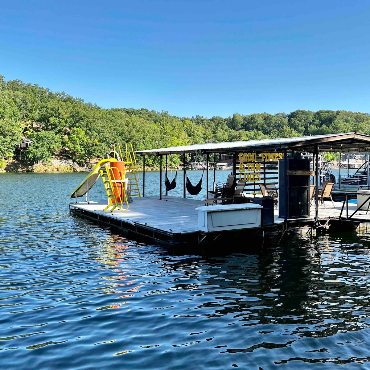 Quiet and secluded cabin, with fantastic lake view. Enjoy great fishing, swimming, sunbathing or shooting down the water slide from private dock. Relax and take in the views from the martini deck, house deck or screened in porch. CO-MO provided wifi keeps you connected to all your favorite streaming entertainment. Great place just to unwind and get away from the stress of city life.