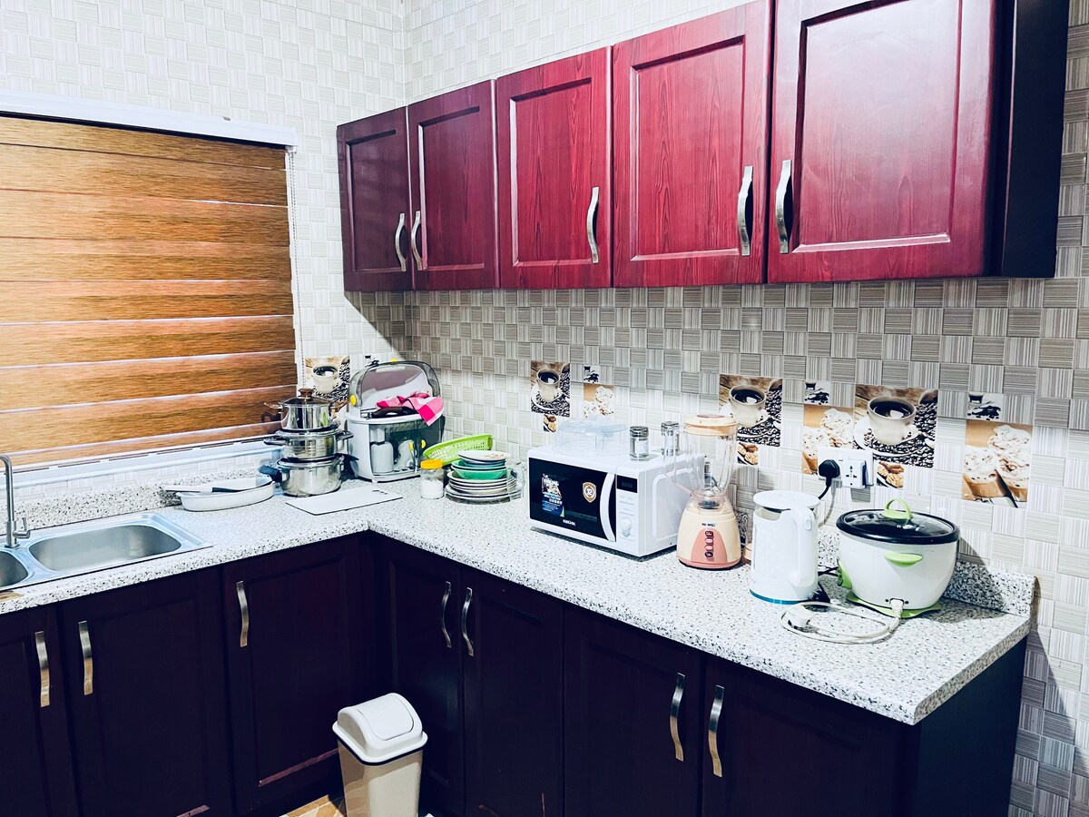 Conveniently located just off the Accra-Tema Motorway, the suite is approximately 30 minutes from Kotoka International Airport and 15 minutes from the Accra Mall, offering easy access to both business and leisure destinations. The Jade Prestige Suite features a spacious bedroom, a comfortable living area, a private balcony, and a fully equipped kitchen — all thoughtfully designed to provide you with comfort, style, and a true home-away-from-home experience.