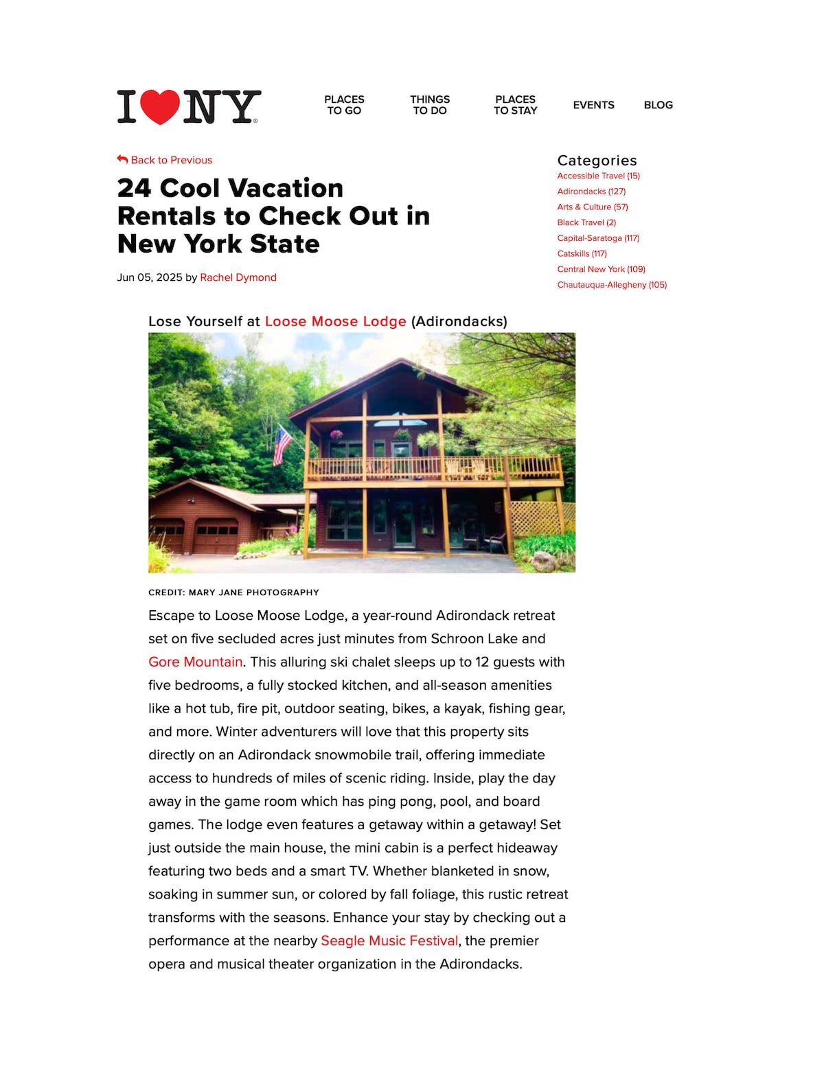 Welcome to Loose Moose Lodge—featured by I LOVE NY as one of NY’s coolest stays! This cozy, family-friendly, four-season chalet on 5 private acres sleeps up to 12 with 5 bedrooms, 8 beds, plus a pullout sofa and Murphy bed. Enjoy two inviting living spaces, a private hot tub, a wraparound porch with outdoor seating, and a game room with ping pong and pool. Just 1.5 miles from Schroon Lake Beach and 20 minutes to Gore Mountain. Adventure by day, unwind by night—and watch for Bruce the moose!