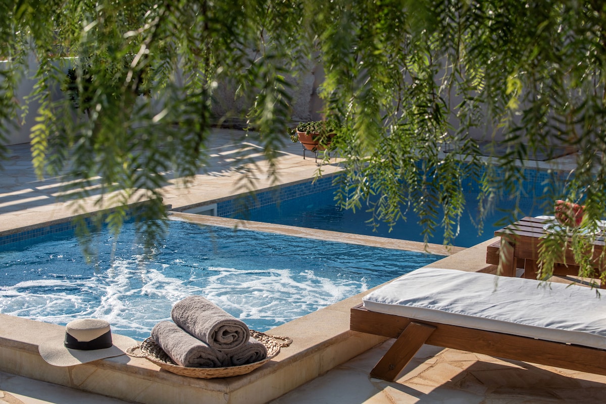 A fully renovated, stonebuilt compound built on top of three ancient greek grottos. It used to be a Venetian olive press factory. Now it's a contemporary holiday home with two pools (indoor and outdoor) and an organic vegetable and local fruit garden