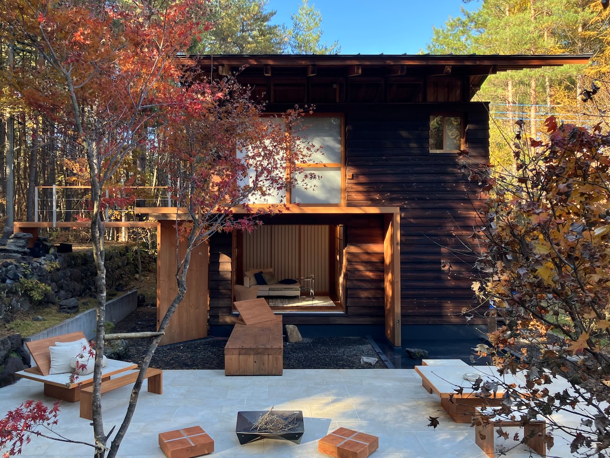 Your Private Forest Escape: One Group Daily Enjoy 3,300㎡ private forest! Gaze at nature, relax in a wood-fired sauna (HUUM stove, spring water plunge), and gather by a bonfire. Experience outdoor freedom with indoor comfort. Your private, unrestricted time starts here. Authentic wood sauna offers deep sensory bliss. Cool down on a spacious deck. Sleeps up to 5 indoors (11 with own tents). Play outdoors, sleep soundly. Find your freedom at Tiny Kita-Karuizawa.