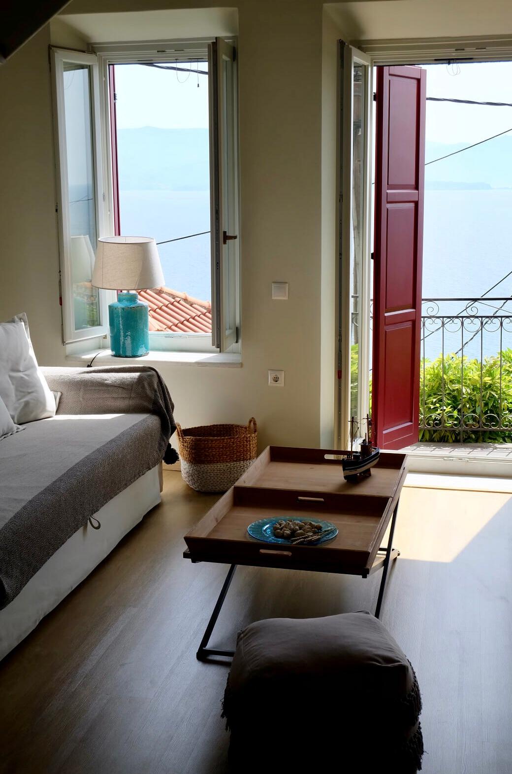 Our Maisonette suite Lotros is an ideal two level apartment, that can facilitate up to 4 guests. On the lower level you will find the sitting area with sofa bed, kitchen and bathroom . The steps lead you to the upper level, where you will find one Queen-size bed and wall closets. The Maisonnete suite provides sea views from both levels.