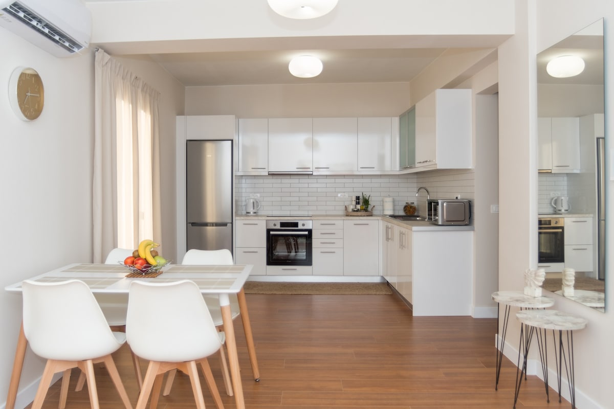 Lucy’s apartment is a newly built apartment, away from the beach with only a short 4 minute walk! Here, you can find a cozy apartment, with all the amenities you need for a cozy and a worries free stay. The living area includes a flat screen TV, a sofa that can be converted to a bed for 2 people and a new cuisine with a fridge and a sitting area. The bedroom has a double bed, night stands with lights and a closet. The bathroom, with the beautiful marble look, contains also a washing machine.