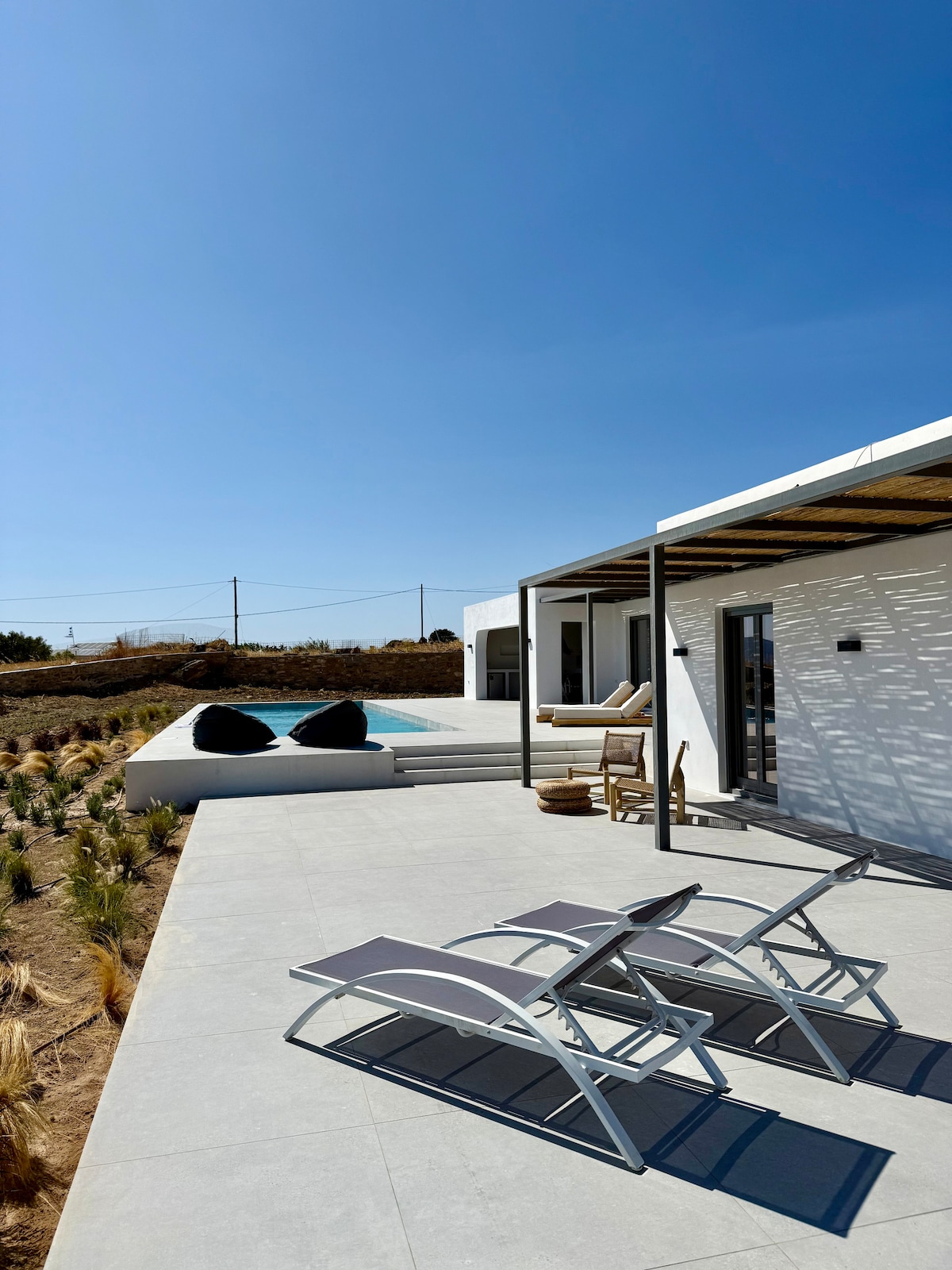 Villa Arismari is located on a serene hillside, surrounded by natural boulders, overlooking the beautiful coast of Orkos. We have a breathtaking panoramic view of the Aegean Sea and our neighboring island of Paros. We are situated between the main beach and smaller bays of Orkos. While enjoying the view that Villa Arismari offers prepare to take your most incredible selfies . Villa Arismari is a beautifully designed villa of Cycladic minimal architecture.