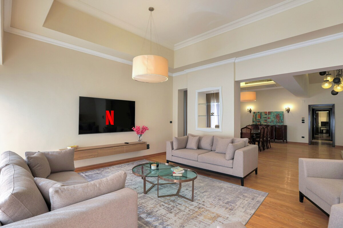 Enjoy an exceptional stay in the heart of Mohandessin. A one-of-a-kind penthouse apartment that blends elegant modern design with total privacy above the city’s buzz featuring a very spacious rooftop overlooking a lively street and a large sports club view.