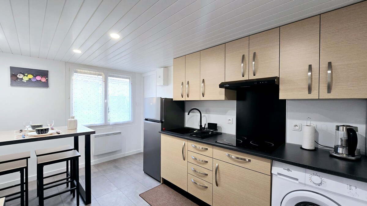 GANNAT, in a small building next to the train station and close to all shops, on the 1st floor, atypical F1 type apartment of 40 m2, just finished renovating, composed of 2 rooms: bedroom (double bed and dressing room) semi open to living room equipped with sofa bed, table, 127 cm HD TV, fitted and equipped kitchen (fridge, range hood, oven, microwave, stove), bathroom with shower and toilet – Very high speed internet in Wi-Fi (fiber) – Secure entrance – Free parking on the street.