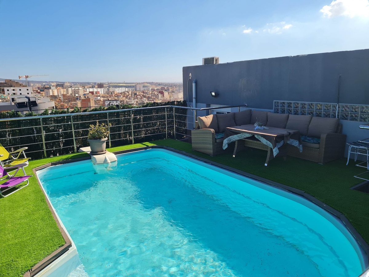 This two-story duplex is ideal for 2 or 3 families. On the ground floor you will find a large living room with a fully equipped kitchen. Upstairs you will find the bedroom and bathrooms. And a swimming pool with a view of the city. The decor is modern and tasteful, and the location is convenient for all amenities.