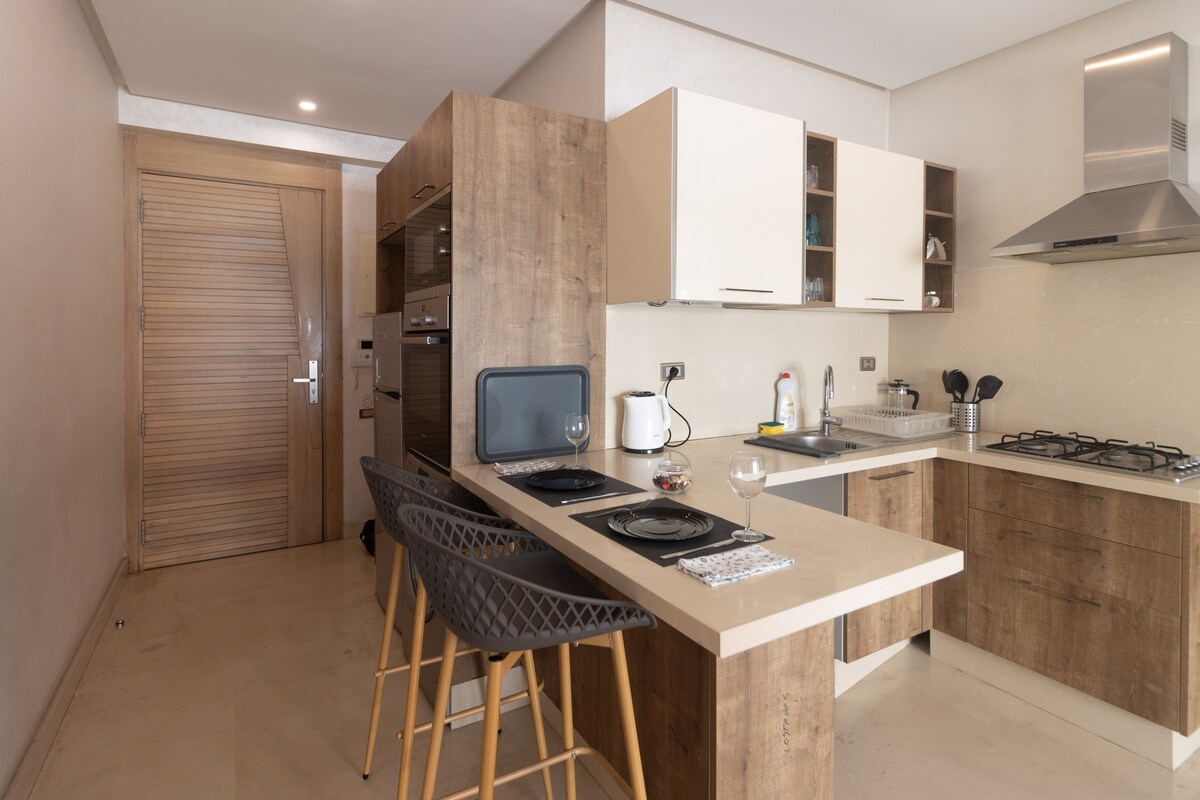 Fully equipped and air-conditioned apartment in a new high-standing building with rooftop, perfect for short or long stays. Prime location close to all amenities. Tram station, restaurants, supermarkets, cafés, and banks are just 2 min walk. Marina Mall, Hassan II Mosque, and Casa Voyageurs train station are 5 min away. According to Moroccan law, a passport copy and a marriage certificate (for Moroccan couples) are required at booking.
