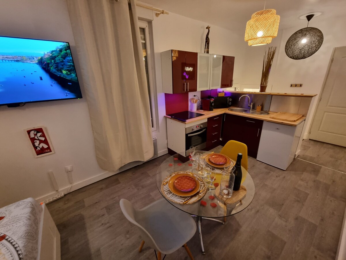 Héra, protector of fertility, had planned to make available to those who wish a magnificent 70 m² apartment, located just 5 minutes from the lively city center of Reims. She has therefore equipped it with a sumptuous hot tub and a large sauna, guaranteeing you an optimal experience of rest and well-being. She decided to make this place unique by equipping it with two windows allowing you to admire the entire apartment from your sofa