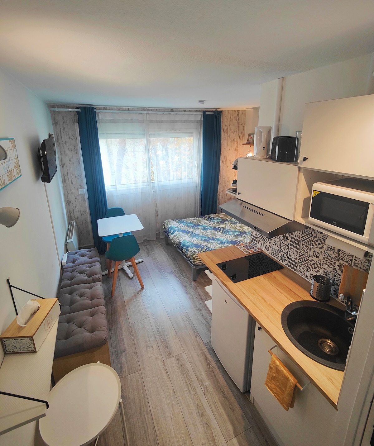 Two-room apartment with a 160cm bed, spacious bedroom, large bathroom and a full équiped kitchen, large connected TV and a confortable sofa, all in a quiet area with parking! Enjoy a loggia for a drink on a semi-terrace. Parking is available for your car, also electric ones, with a charging socket or for your bikes. See you soon in my little Aixois cocoon!