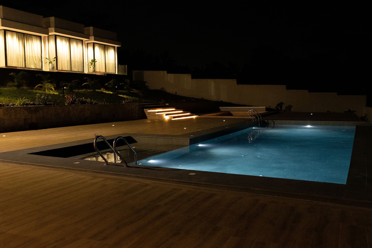 Luxury 3-bed, 3.5 -bath modern duplex in the Ghana’s Aburi Mountains area, located in Obosomase. Enjoy panoramic Mountain View’s overlooking the city from balconies on multiple levels, creating a romantic display of lights and colors to change the mood and ambiance. Modern kitchen with all the convenient gadgets to cook meals. Features private rooftop pool, luxury bathrooms, AC/fans recessed lighting, Wifi, and a backup generator for sustainability ultimate comfort and style.