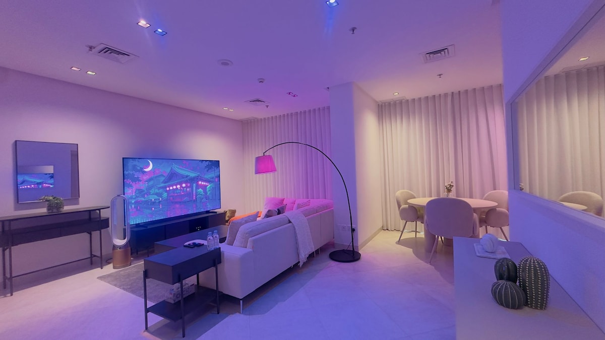 💎Self Check in fully furnished apartment in Salmiya 💎5G ultra speed WiFi 💎Philips Hue color light with mobile app 💎Self Check-In with Electronic lock 💎55’Smart TV / Bluetooth Sound bar 💎50”TV in Bedroom 💎Netflix,OSN, Prime, ZeeTV,SDisney 💎Toiletries & bath towels provided 💎Cable free mobile chargers 💎Dr. Vranjes luxury oil diffuser