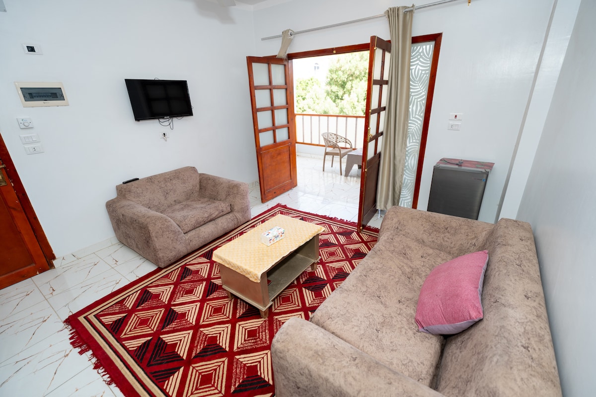 A one-bedroom unit,first floor, 1 min from Colossi of Memnon & Medinet Habu, this cozy first-floor space features a king bedroom, living room, kitchen, bathroom, and balcony with scenic views. Close to Deir el-Medina & Valley of the Queens (3 mins). Luxor Airport: 20 mins. On Memnon's main street near shops, restaurants, and cafés. Easy access to local transport, Indrive, and hot air balloon site nearby—perfect for a comfortable stay!