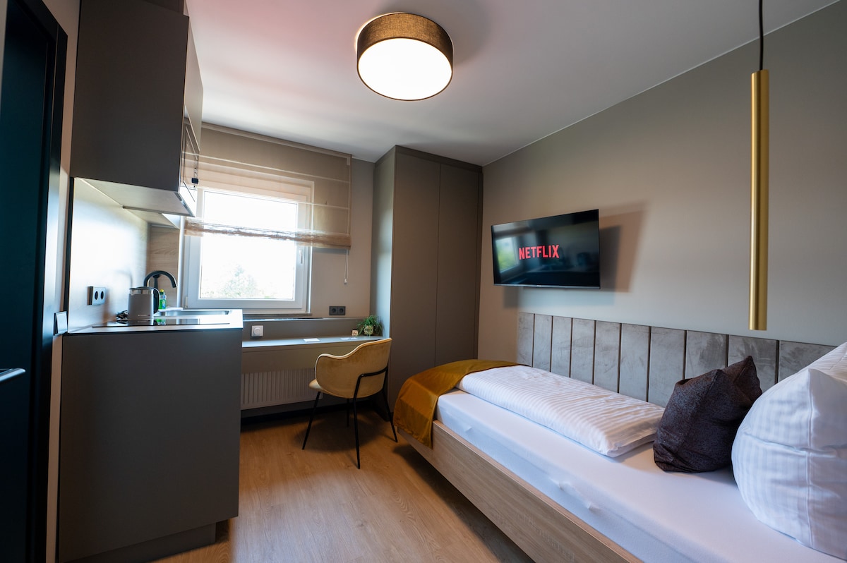 Einzelzimmer - 18 m² Unser komfortables Einzelzimmer bietet alles, was Sie für einen angenehmen Aufenthalt benötigen. - Boxspringbett (1,00 x 2,00 m) mit neuen Bettdecken - Ein Schreibtisch mit Stuhl. - Kleiner Kühlschrank - Elektrische Rollläden - Eigenes Badezimmer mit Dusche und Toilette - Smart-TV und WLAN - Frische Handtücher inklusive - Gemeinschaftlich nutzbar: Große Küche pro Stockwerk mit Tisch und Stühlen und Waschmaschine & Trockner