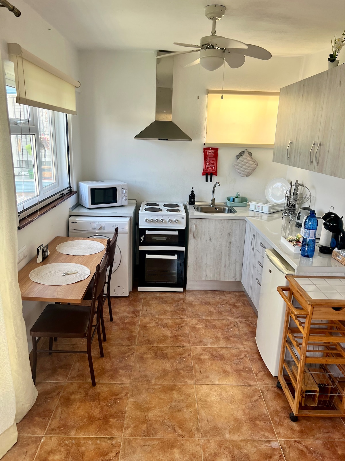 Winter (Nov-March) per month only. This cave sleeps max 3 people, there is a double bed (160x200) and a sofa bed.(100x 185). There is a fully equipped kitchen, a bathroom with shower, sink and toilet and a large bedroom with closet space. The entrance door and the window have mosquito screens. The cave is, even in summer, nice and cool inside. The property has a large swimming pool , garden with lots of chill out areas and a roof terrace for yoga. I live here all year with my 3 small dogs.