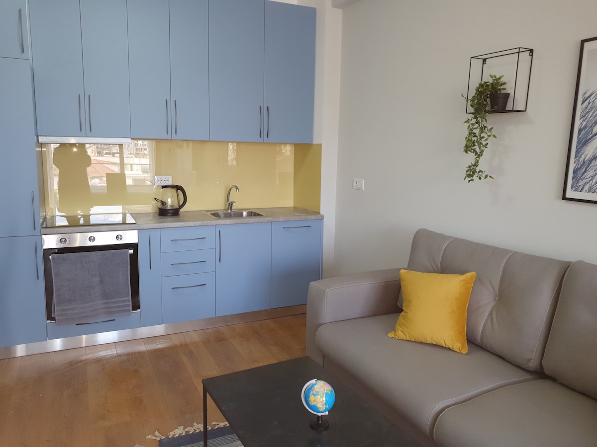 Enjoy a stylish experience at this centrally-located new studio and is only 150m walking distance from city centre of Tirana, museums, fine restaurants, shopping centers, bus stations and other attractions. Modern studio is fully equipped with the newest technology appliances, as Smart TV, Wifi, Washing machine, microwave, refrigerator, hair dryer, linens, towels, kitchen sets. The front-yard is surrounded by flowers and offer a dinning set. It has its own entrance and free parking on premises
