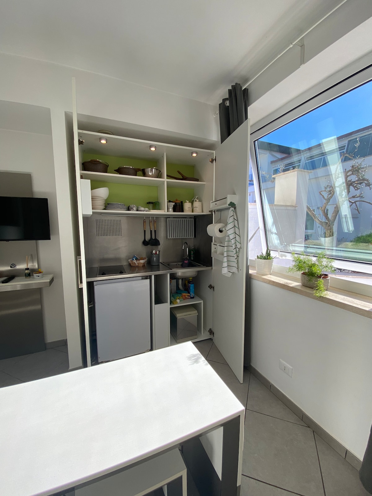 A refined studio apartment just renovated and furnished within an ancient building with an independent entrance. The apartment is located at few meters from the train station and the main street of Albano Laziale. Ideal for a holiday, you can visit the entire town by walking. Equipped with television, air conditioning, independent heating, washing machine, double bed, wardrobe, complete kitchen, space to eat and bathroom with large shower for two people.