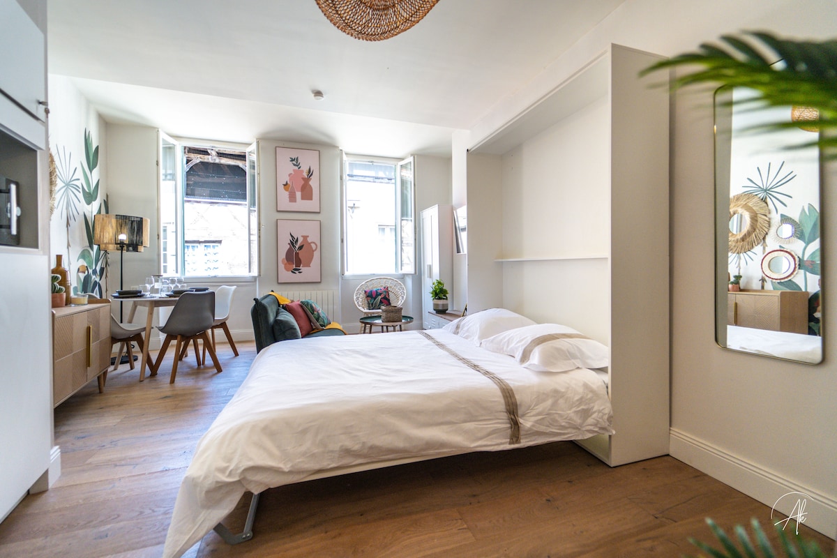 Welcome to this charming studio! Enjoy an equipped and comfortable home near the historic heart and its many treasures such as Sainte-Cécile Cathedral. This apartment offers stunning views of the Tarn River, its bridges and old Albi. This studio is equipped with all the comforts necessary to make your stay pleasant. We'd love to host you in our cocoon so you can make the most of Albi's charm. Free parking nearby the space.