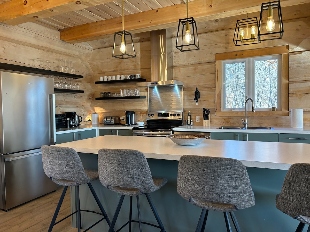 Perfect nature retreat in the heart of the Laurentian. Discover this unique Canadian log home built by local prestige company Harkins. Peaceful clear water lake directly in front of this hidden gem. ♦ Indoor wood fireplace next to comfy living room & smart TV ♦ Two Spacious Bedrooms with King & Queen bed ♦ Private Natural Lake Access ♦ Balcony with BBQ. Fire Pit ♦ Pure intimacy, no neighbours close ♦ Work desk and Wi-Fi