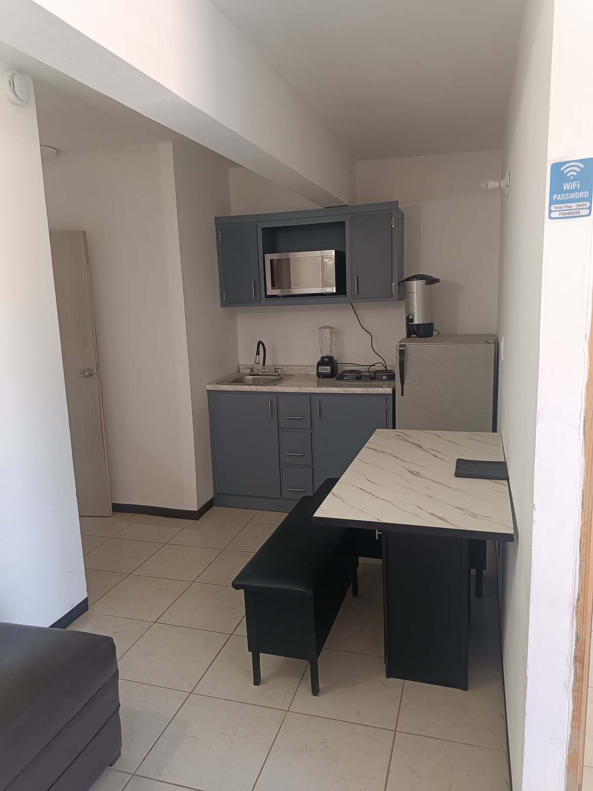 Cómodo y confortable, cuenta con una recámara amplia con cama matrimonial, baño con agua caliente, mini split frío/calor, frigo bar, cafetera eléctrica y horno microondas para que tu estancia por turismo, placer ó trabajo sea como si estuviera en casa. El internet inalámbrico y Smart TV también están disponibles para que tu estancia sea completa, si tienes tu cuenta de Netflix puedes configurarla para que disfrutes de tu aplicación, si necesitas asistencia puedes contactarme con toda confianza.