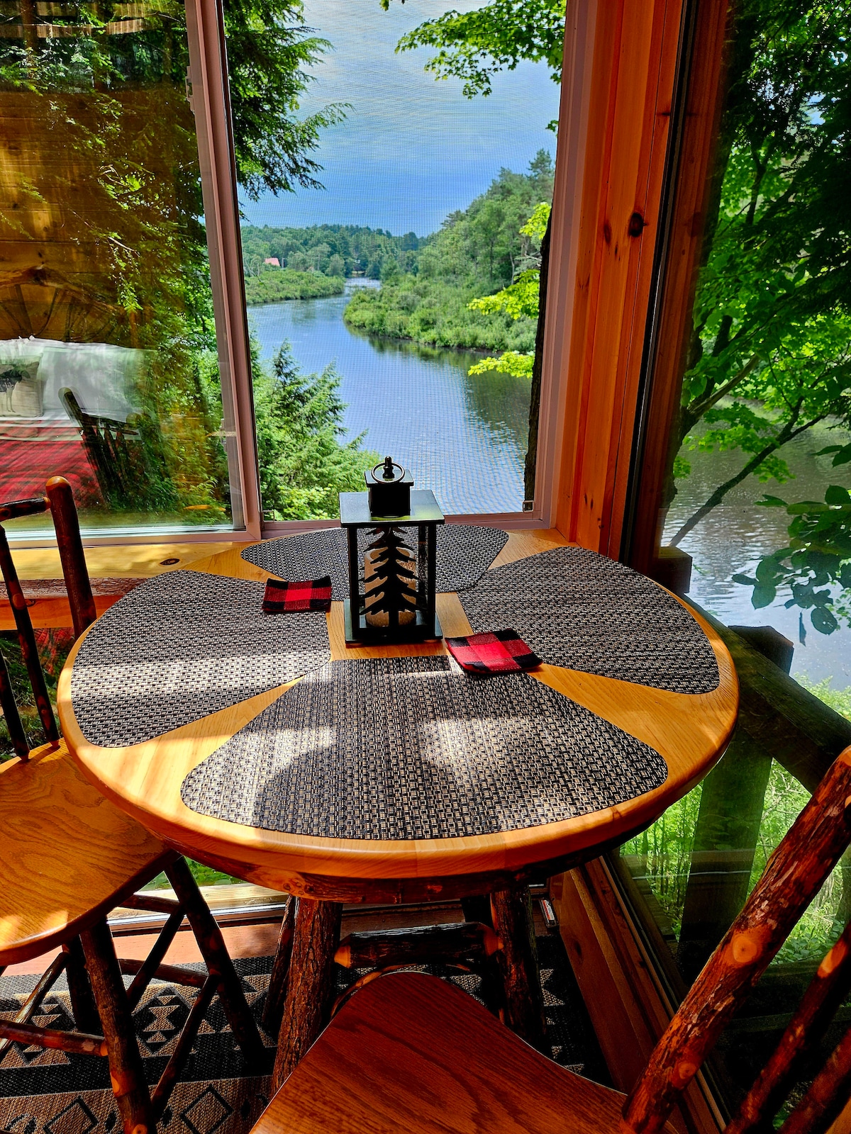 Perched in privacy on the Black River is a rustic Tree House designed for adults only who are looking to be off the grid and connect with Mother Nature. Glamping at its best! The very private Tree House is perched on a hill overlooking the peaceful river. The quaint treehouse has five sides of glass and screens to view the river. This is built around trees but you enter from ground level. A power pack is available to charge cell phones and make coffee. Relax by a campfire at river's edge.