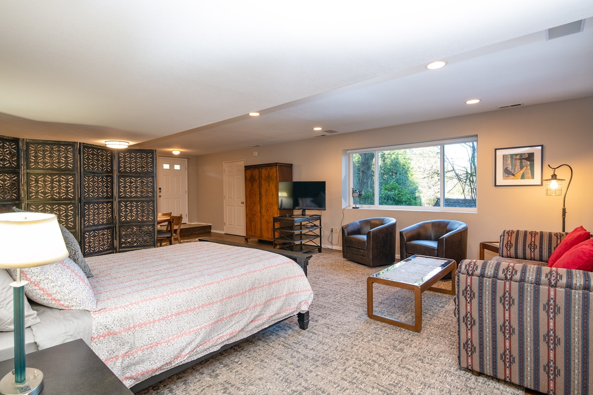 Relax in this beautifully decorated suite, perfectly located for exploring Seattle, Bellevue, Kirkland, Bothell, and nearby lakes, beaches, state parks, and waterfalls. Discover local restaurants, cafés, and shops just min away. After a day of adventure, unwind with a hot shower, then sink into the plush king-size bed. Enjoy Netflix on a 65" HD TV, all in the privacy of your own 500 sf space. With a private entry and a quiet neighborhood, you’ll have complete tranquility—no shared amenities.