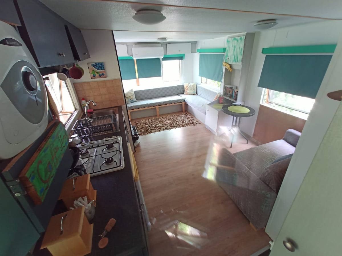 The mobile home can accommodate a maximum of 4 people, but it can also be perfectly arranged for a romantic couple's getaway by the sea. (the number of people is selected from the application). It has a bedroom with a double bed, a living room with an extendable sofa, a fully equipped kitchen and a private bathroom. In front of the house, there is an intimate terrace. The 3 owned houses are located in the same courtyard.