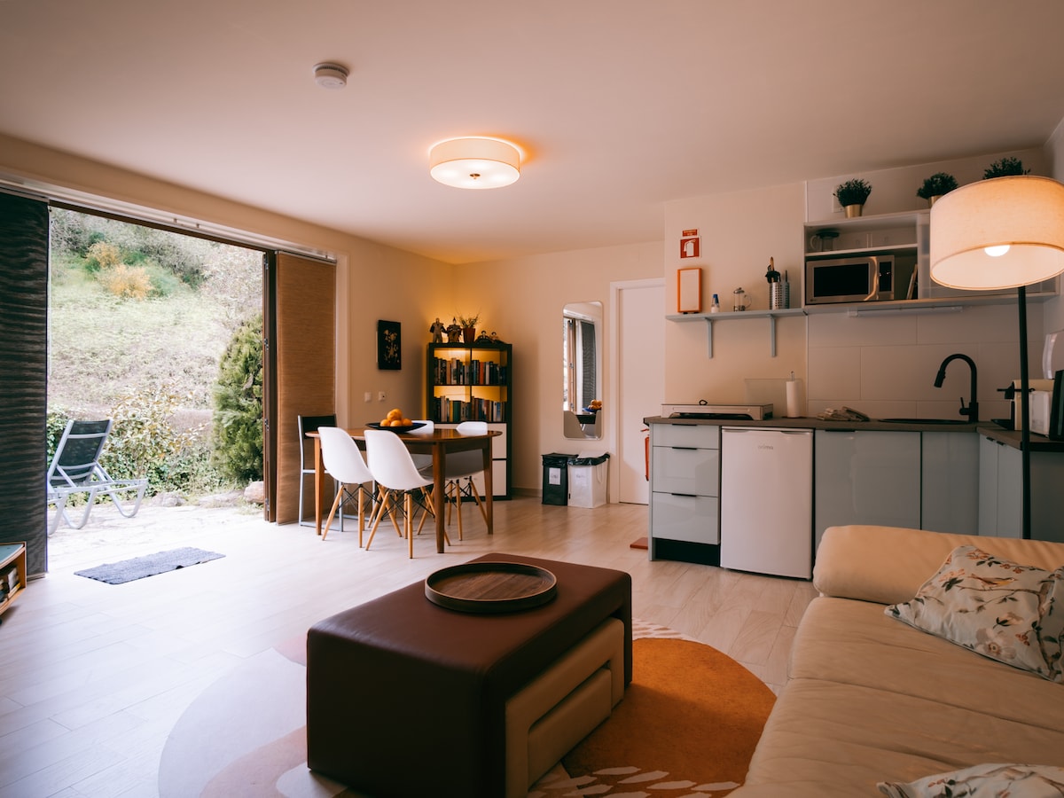 Among the green hills of Southwest Alentejo Natural Park, along the Rota Vicentina trails and just 20 km from the wild Atlantic coast, this peaceful studio enjoys over 300 days of sunshine a year Located in the small village of Castelão (São Luís), the fully renovated studio is attached to our family home but offers privacy. It’s perfect for a couple, with an open bedroom, cozy living area with pellet burner, fully equipped kitchen, bathroom, and a private outdoor space with beautiful views.