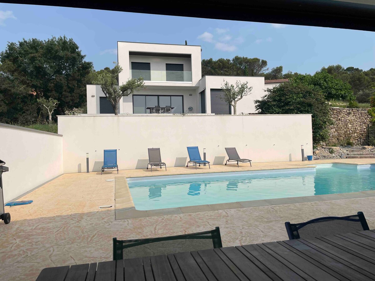 villa with dominant view with pool and pool house: inside: large living room 3 Bedroom 2 bathrooms 2 powder rooms 1 office 1 weight bench + mat + small dumbbells 1 bathtub Air-Conditioning outside: 1 pool 1 pool house 1 summer kitchen 1 gas camping stove for barbecues 1 exterior toilet 1 outdoor TV 1 petanque court villa located in a well-placed area, nearby you have a health course + park for children. Axel