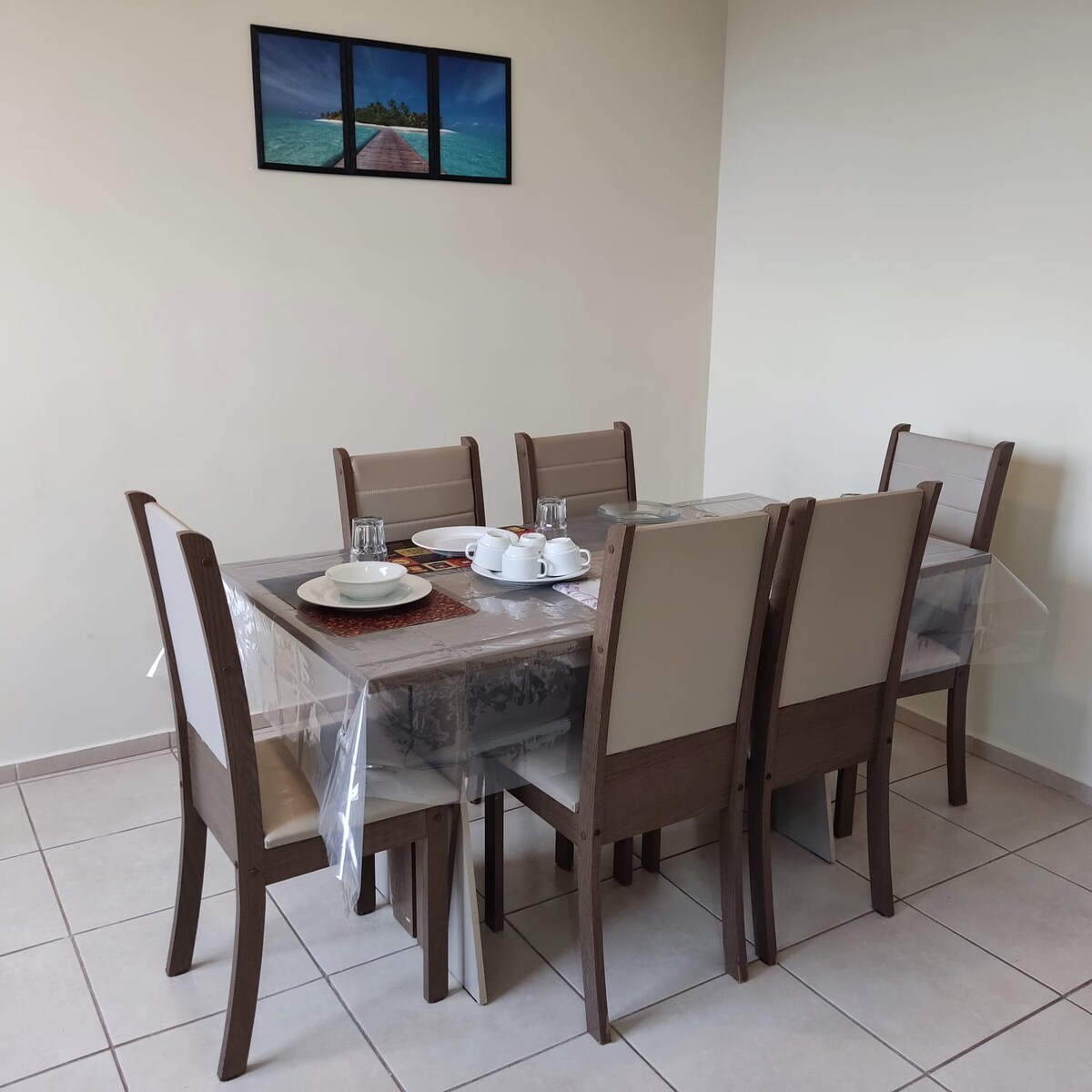 Excellent apartment. With capacity for up to 5 people, but 1 will have to sleep in an auxiliary bed. Queen-size suite. Single room with 2 beds and 2 extra beds, bathroom, living room with sofa and TV. NO AIR CONDITIONING, only 2 fans. Living room with table and 4 chairs and bench with 2 stools. Service/Laundry Machine Area. Decorated apartment with protective screen. Gated community, 24-hour security, 4 swimming pools, fitness center, 1 underground garage. Cond. Sports Club, Guará 2, local commerce, pharmacy, bakery in the building next door.