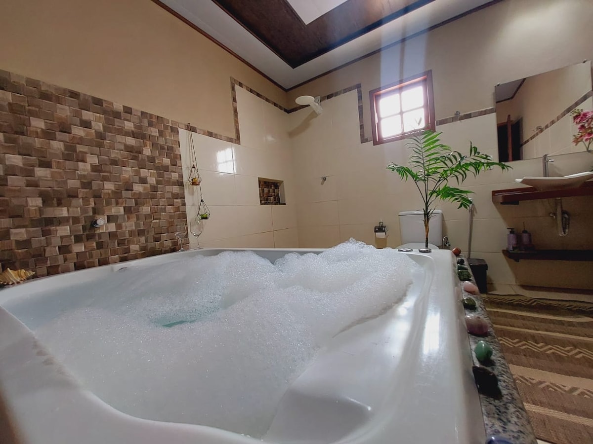 Disconnect from the hustle and bustle and relax in a charming chalet. Surrounded by nature and a beautiful sunset. It is perfect for couples looking for comfort and tranquility and a romantic atmosphere. It is 10 minutes from the city center, and has Wi-Fi, a private heated Jacuzzi, a full kitchen and a barbecue grill. The space has all the necessary utensils for preparing meals, with Café & Cia just 1 km away. There are towels, bathrobes, bed linen, 4 pillows, duvets and blankets.