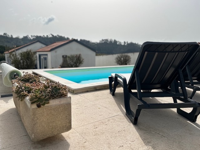 Nazare pet-friendly self-catering 4 bedroom, 3 bathroom villa with outdoor heated pool and barbecue. Can accommodate 9 guests. -4 bedrooms: three with a double bed and one with two single beds. -Three bathrooms: two with a toilet, sink and walking shower (one of them ensuite) and one with a toilet, sink, bath and walk-in shower. -Fully equipped kitchen. -Private swimming pool (heated in summer) onsite -Television, internet access. - Two bicycles 🚲 🚲 -Linen, towels and an iron included