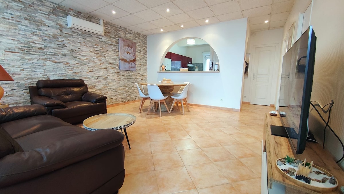 Apartment in villa 5 minutes from the sea in a quiet subdivision. 55 m2, 3 rooms, 2 bedrooms, 1 bathroom with wc, fully equipped American kitchen, 1 living room, barbecue, garden table and chairs, umbrella, 2 sunbeds. Air conditioning in all rooms, city centre 2 min max by car, or access by walking along the seaside, possibility of swimming on the way (much appreciated by holidaymakers.)The beautiful sandy beach of the red island can be reached in just 10 min walk