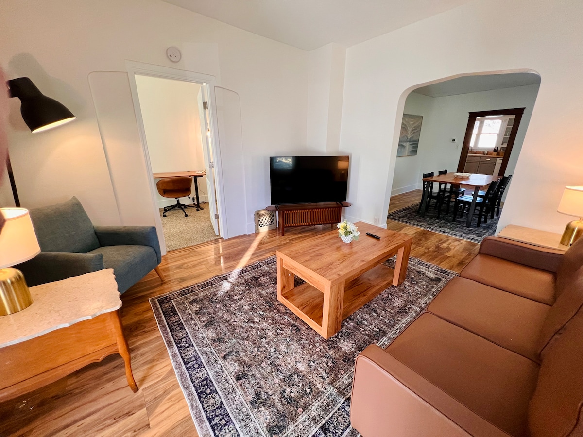 Enjoy a private, cozy stay in this basement apartment, one of three unique spaces within this house, located near downtown on the River Greenway. Take advantage of the fully remodeled kitchen, then curl up in front of the electric fireplace and play some games in the living room. Washer and Dryer available for all house guests, with access also in the basement (separate from the apartment unit).