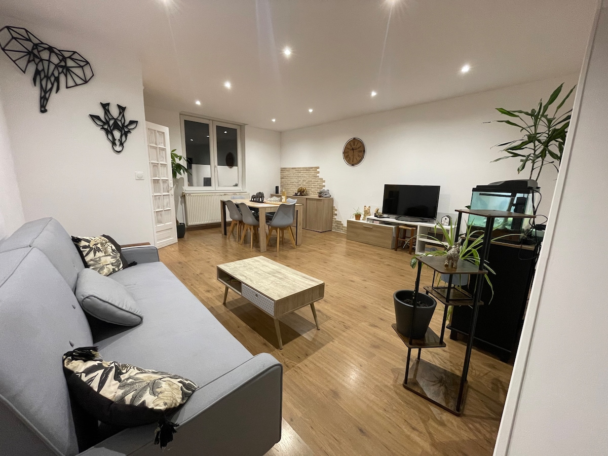 60 m2 apartment located in the city center, accommodating 4 people, on the 1st floor with stairs. Possibility of 4 beds: 1 bedroom with double bed (160 cm), a sofa bed (beds made on arrival). TV + fiber Pack 'n play and booster seat available 1 private parking space Key box Ideal for visiting our region: mining heritage (Slag heaps for walks), Braderie de Lille, Louvre Museum, Lewarde Mine Museum, beaches of the Nord, ... Water areas less than 15 minutes away.