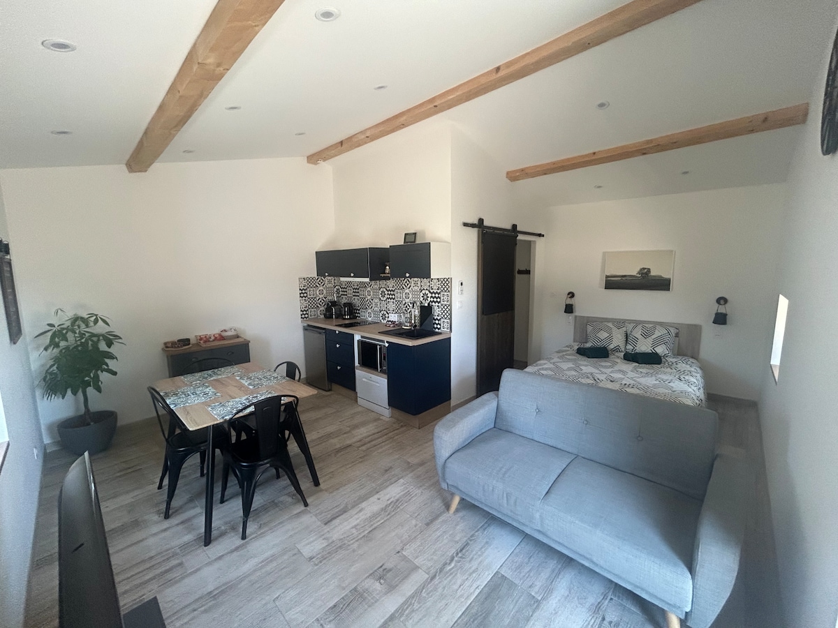 Located in the Drôme, the studio is independent, on the ground floor of a stone house, facing a flowery and wooded garden. Bright in the afternoon, cool in summer, it is fully equipped with kitchenette and bar table. The bathroom has a walk-in shower, sink and classic toilet. Two beds are available: a 120 x 200 cm bed in the bedroom and a 140 x 200 cm sofa bed in the main room.